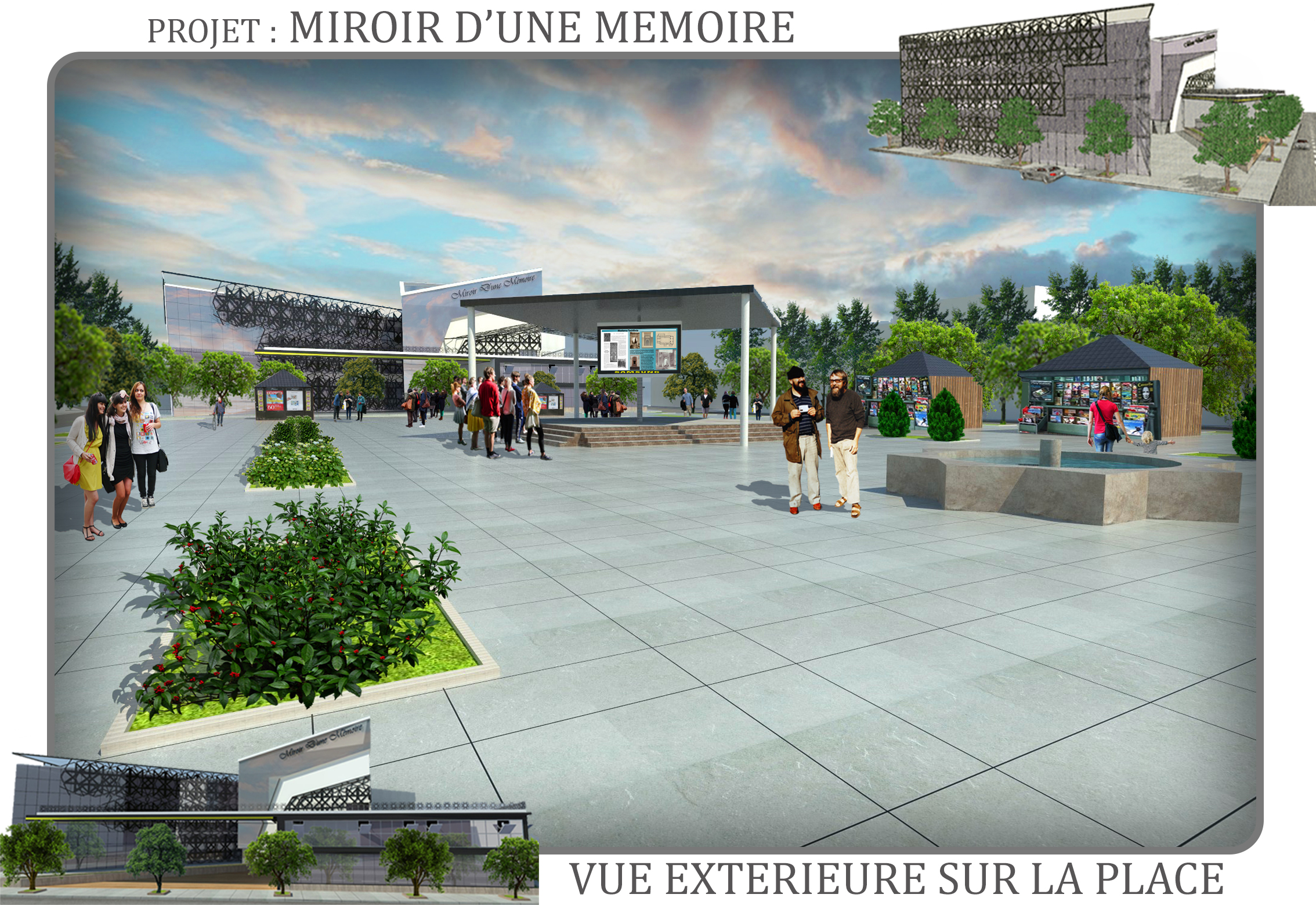 Notre but principale était de revalorisé la place Emir Abdelkader et Med khémisti « EL BLACE » comme une composante historique majeure de la ville de façon à redonner une attractivité à la ville ancienne (la médina) ainsi de sauvegarder la mémoire du lieu et de la société ou notre projet sera la porte de la médina et renforcer l’aspect culturel du centre-ville c’est dans ce dernier que l’on a puisé pour faire sortir avec l’idée de construire un projet du sens culturel identitaire à la ville de Tlemcen et donc la réinterprétation des styles architecturaux en les lie avec des éléments de références traditionnels mais avec une touche plus moderne en intégrant des nouvelles techniques on cherchant la mixité entre la modernité et les traditions.
